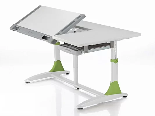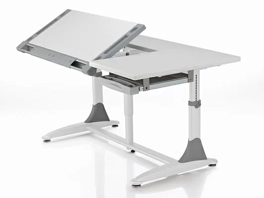 На этой парте размещается все необходимое для работы, так что во время творческого процесса Вам не придется прерываться на поиски нужных рабочих принадлежностей. Эффективность работы за столом зависит от того, насколько удобно расположены на его поверхности все рабочие принадлежности. Угол наклона рабочей поверхности можно плавно отрегулировать от 0° до 30° с помощью механизма "Газлифт", установив столешницу в наиболее удобном положении для выбранного вида работы. Сделать это без особых усилий при переходе от одного вида деятельности к другому может даже школьник. Остальная часть столешницы при этом остается неподвижной – на ней можно расположить все необходимые учебные и канцелярские принадлежности;