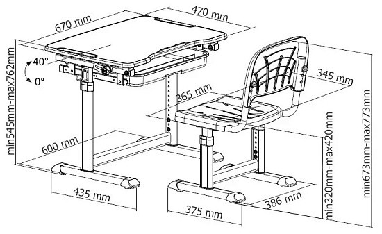 Стол и стул могут быть легко отрегулированы по высоте, что позволяет оптимально адаптировать его под соответствующий рост ребенка.