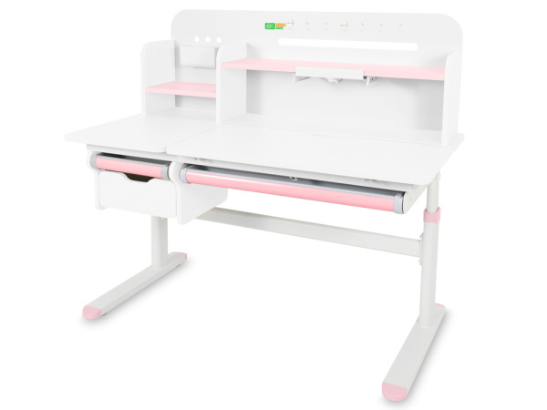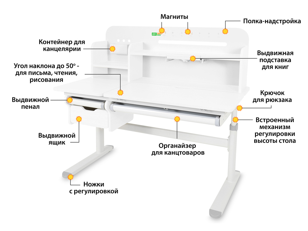 Регулировка высоты столешницы 52-76 см. Высота стола регулируется с помощью механической ручки, что дает возможность легко настроить парту под рост ребенка. Стол с трансформирующейся столешницей, которая изменяет угол наклона до 50 градусов с помощью механизма газлифт. Вы можете установить оптимальный угол наклона столешницы для чтения, письма или рисования.