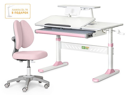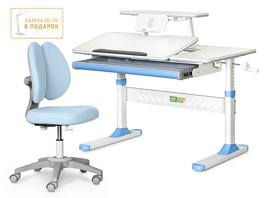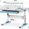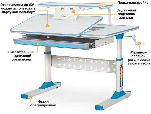 Стол дополнен съемной полкой, на которой можно размещать учебники. Полка имеет регулируемую металлическую подставку для книги. Подставка для книг находится на безопасном расстоянии от глаз ребенка, таким образом сохранится зрение. По окончанию работы, подставку можно задвинуть.