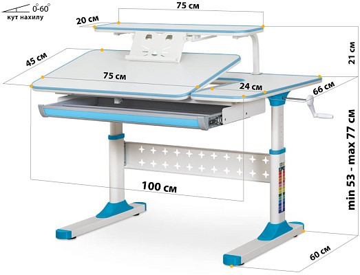 Столешница разделена на подвижную и не подвижную части. Подвижная часть столешницы меняет угол наклона до 60 градусов. Плавность регулировки обеспечивает газлифт. Для изменения положения столешницы достаточно мягко нажать на рычажок и потянуть на себя. Для безопасности регулировки детьми на столешнице предусмотрен зазор, чтобы не прищемить пальцы. Благодаря большому диапазону угла наклона столешницу можно использовать, как мольберт.