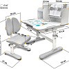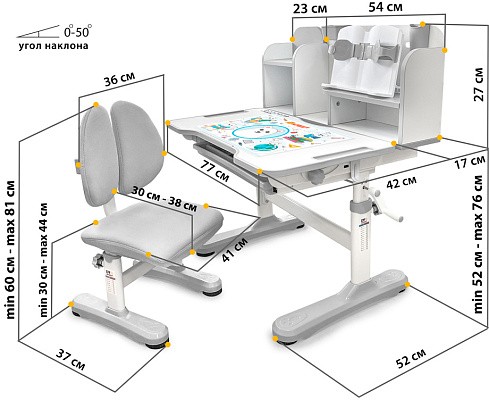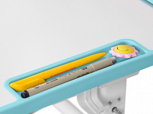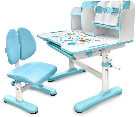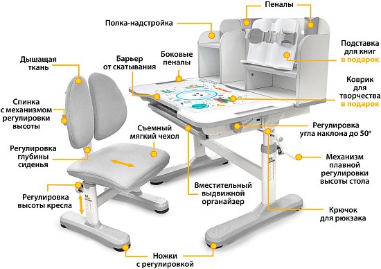 Главной особенностью комплекта является растущее кресло с двойной ортопедической спинкой и мягким съемным сиденьем, обтянутым мебельной дышащей тканью. Кресло регулируется по высоте и глубине специальными винтами. Максимальная нагрузка - 60 кг. На каркасе крепится ручка для удобного перемещения кресла по комнате.