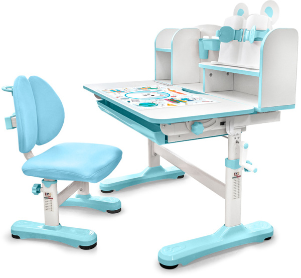 Главной особенностью комплекта является растущее кресло с двойной ортопедической спинкой и мягким съемным сиденьем, обтянутым мебельной дышащей тканью. Кресло регулируется по высоте и глубине специальными винтами. Максимальная нагрузка - 60 кг. На каркасе крепится ручка для удобного перемещения кресла по комнате.