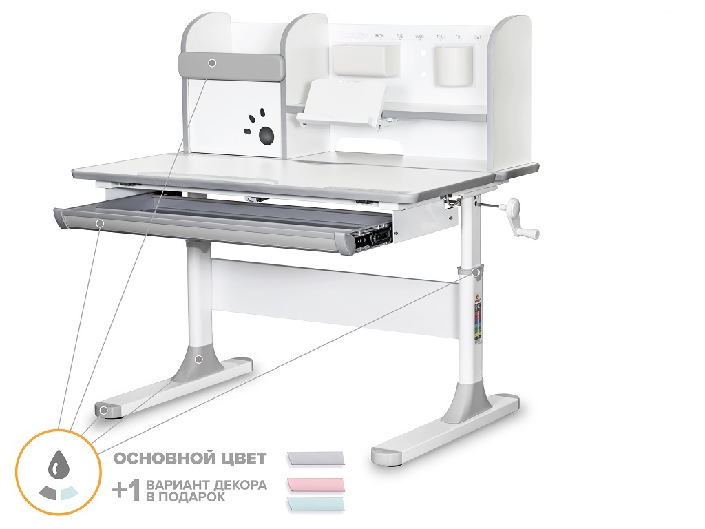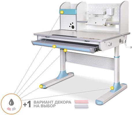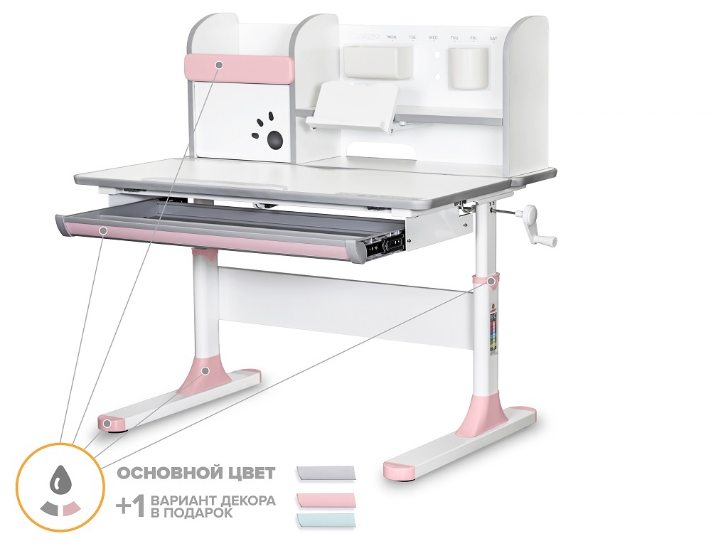 Одной из важных особенностей данной модели является наличие цветных накладок в подарок! Приобретайте полную комплектацию стола в сером цвете и получите розовые либо голубые накладки совершенно бесплатно! Накладки меняются на ножках, выдвижном органайзере и полке надстройке.