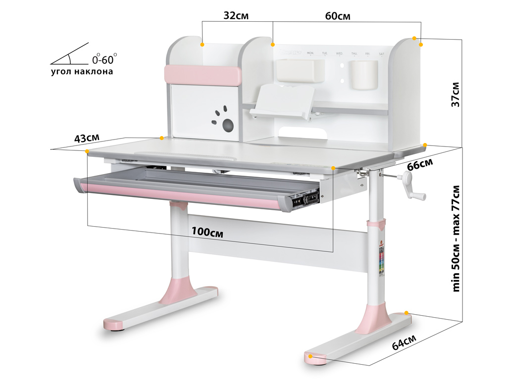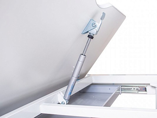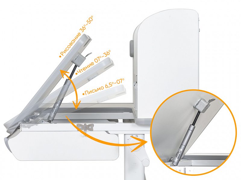 С помощью газлифта подвижная часть столешницы меняет угол наклона до 60 градусов, что помогает сохранить правильную осанку при работе за столом.