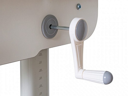 Высота стола регулируется с помощью червячного механизма ручкой, которую при сборке можно установить либо справа, либо слева.