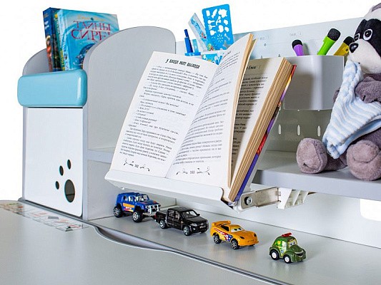 Удобным дополнением для стола является полка - надстройка с двумя полочками поменьше и шкафчиком с металлической дверцей. Теперь книги и тетради всегда будут на своих местах. Задняя стенка надстройки металлическая, ее можно использовать для закрепления заметок магнитами, а также для удобного хранения письменных принадлежностей в двух подвесных емкостях. Прекрасным дополнением к полке является прочная выдвижная подставка для книг с изменяемым углом наклона. При необходимости подставка складывается.