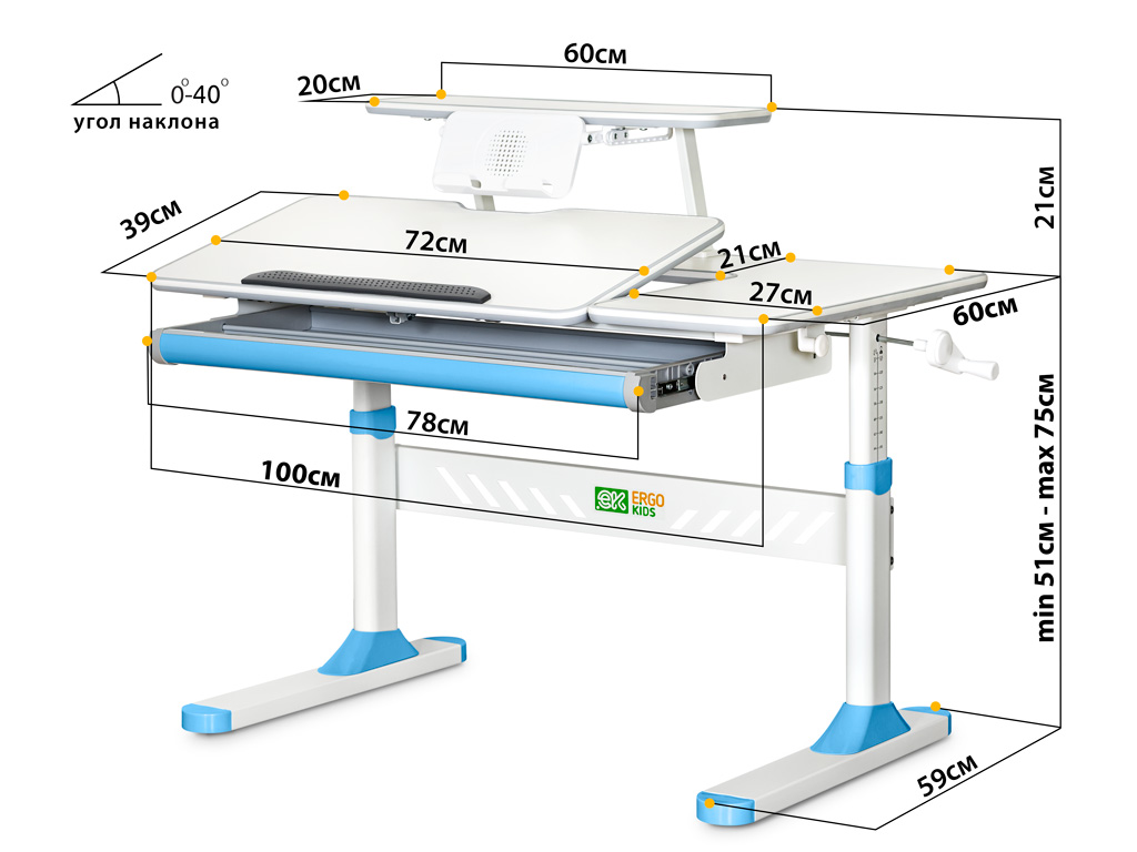 Столешница разделена на подвижную и не подвижную части. Подвижная часть столешницы меняет угол наклона до 60 градусов. Плавность регулировки обеспечивает газлифт. Для изменения положения столешницы достаточно мягко нажать на рычажок и потянуть на себя. Для безопасности регулировки детьми на столешнице предусмотрен зазор, чтобы не прищемить пальцы. Благодаря большому диапазону угла наклона столешницу можно использовать, как мольберт.