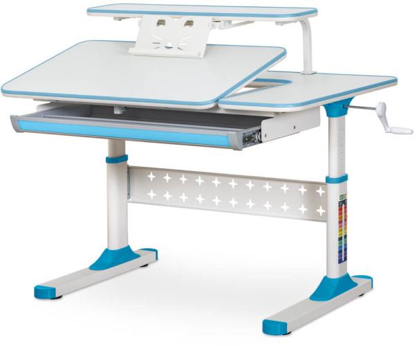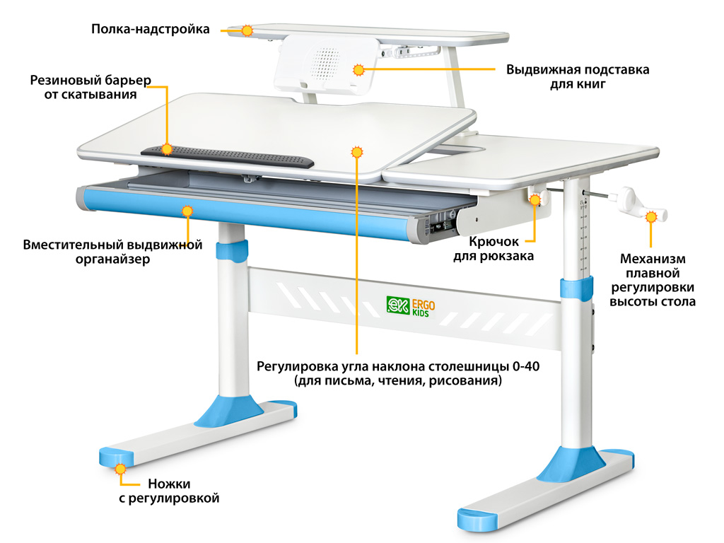Стол дополнен съемной полкой, на которой можно размещать учебники. Полка имеет регулируемую металлическую подставку для книги. Подставка для книг находится на безопасном расстоянии от глаз ребенка, таким образом сохранится зрение. По окончанию работы, подставку можно задвинуть.