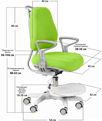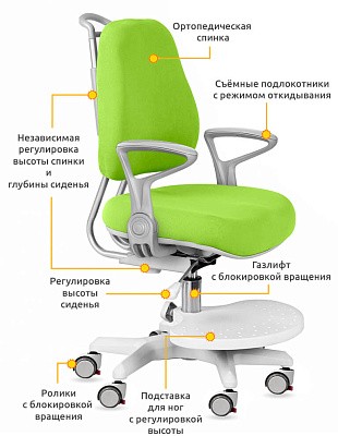 У кресла независимая регулировка высоты спинки и глубины сиденья, что позволяет еще более точно подстроить кресло под параметры ребенка. Высота всего кресла регулируется с помощью качественного газлифта. Отсутствие вращения газлифта помогает зафиксировать правильное положение ребенка во время занятий.