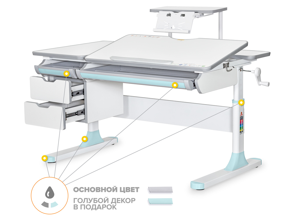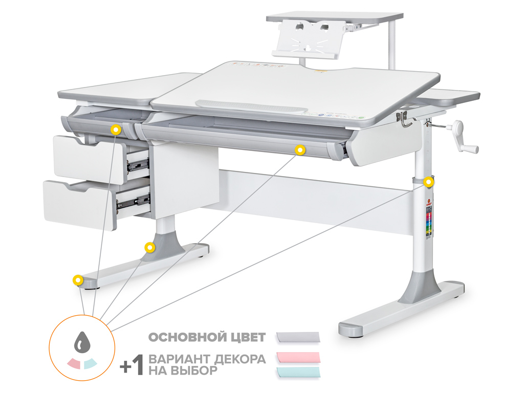 Одной из важных особенностей данной модели является наличие сменных цветных накладок в подарок! Приобретайте комплектацию стола Lite или с полкой BD S-50 в сером цвете и получите розовые либо голубые накладки совершенно бесплатно! Накладки меняются на ножках, пластиковом пенале и выдвижном органайзере.