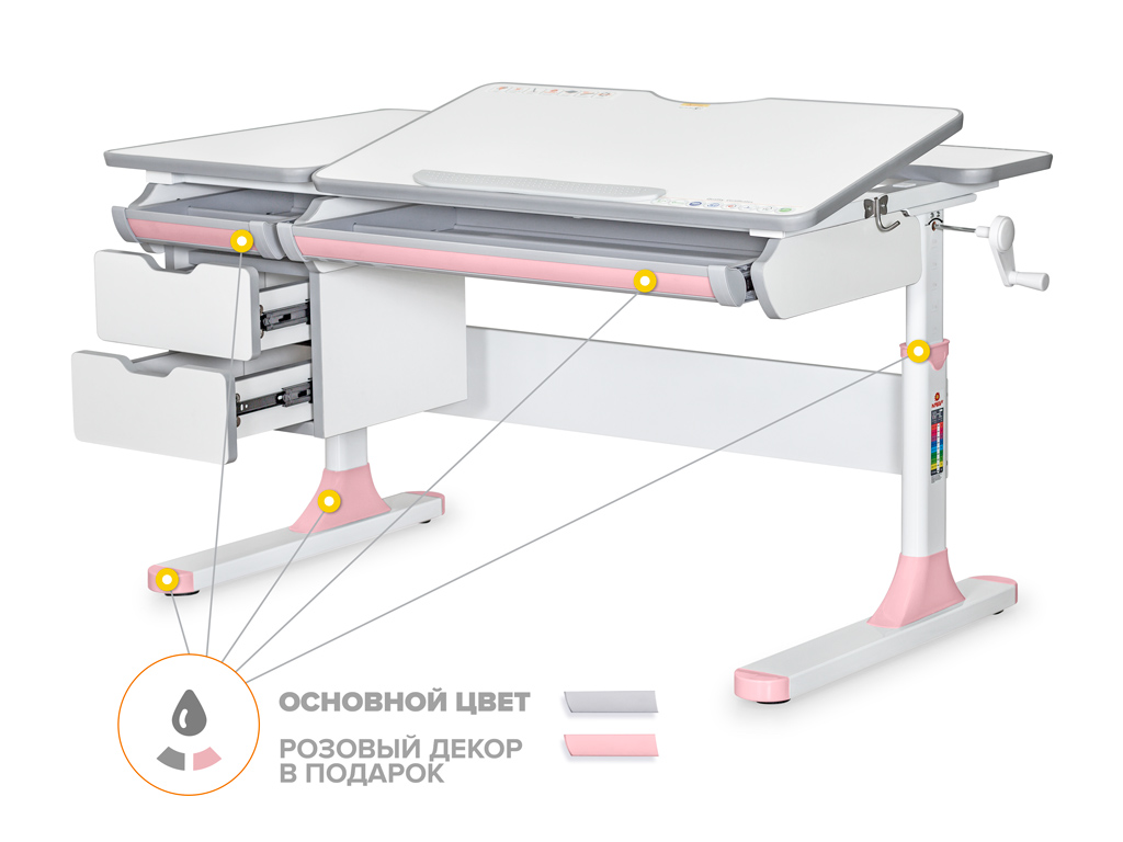 Одной из важных особенностей данной модели является наличие сменных цветных накладок в подарок! Приобретайте комплектацию стола Lite или с полкой BD S-50 в сером цвете и получите розовые либо голубые накладки совершенно бесплатно! Накладки меняются на ножках, пластиковом пенале и выдвижном органайзере.