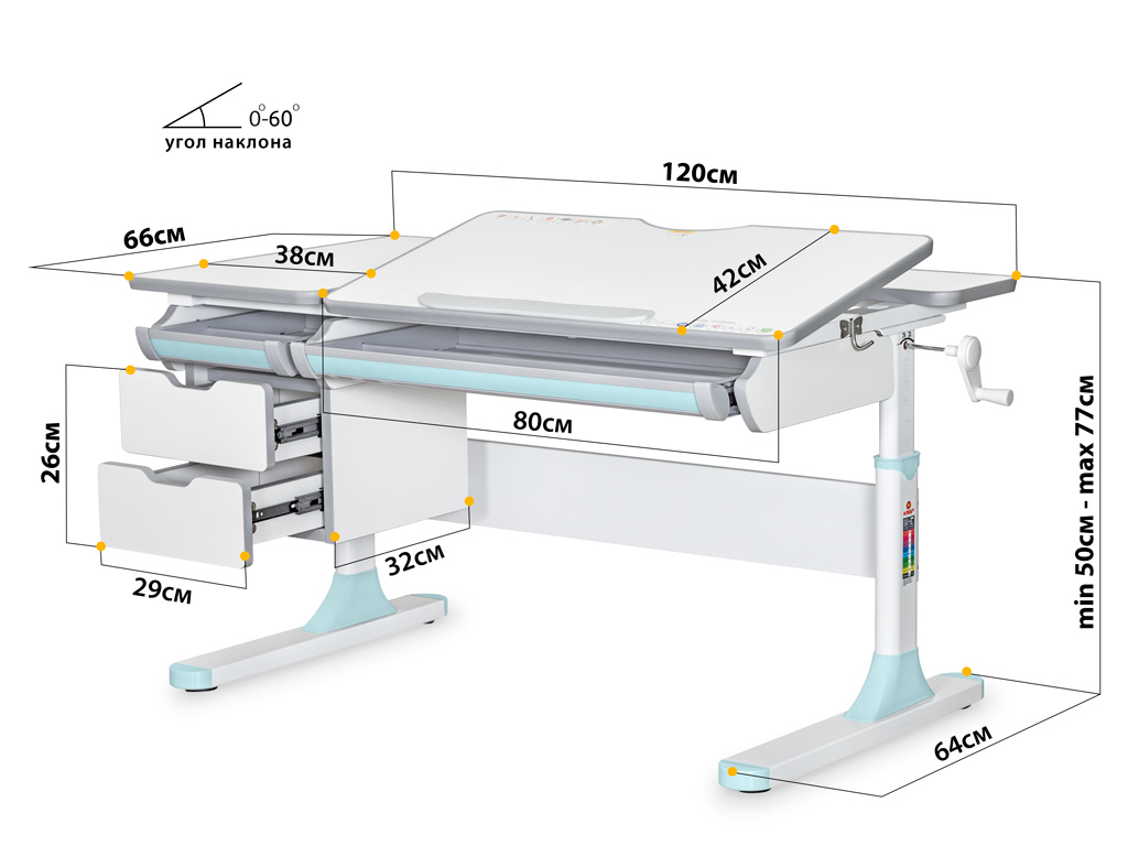 С помощью газлифта подвижная часть столешницы меняет угол наклона до 60 градусов. Столешницу с отрегулированым углом наклона можно использовать для письма, чтения и рисования.