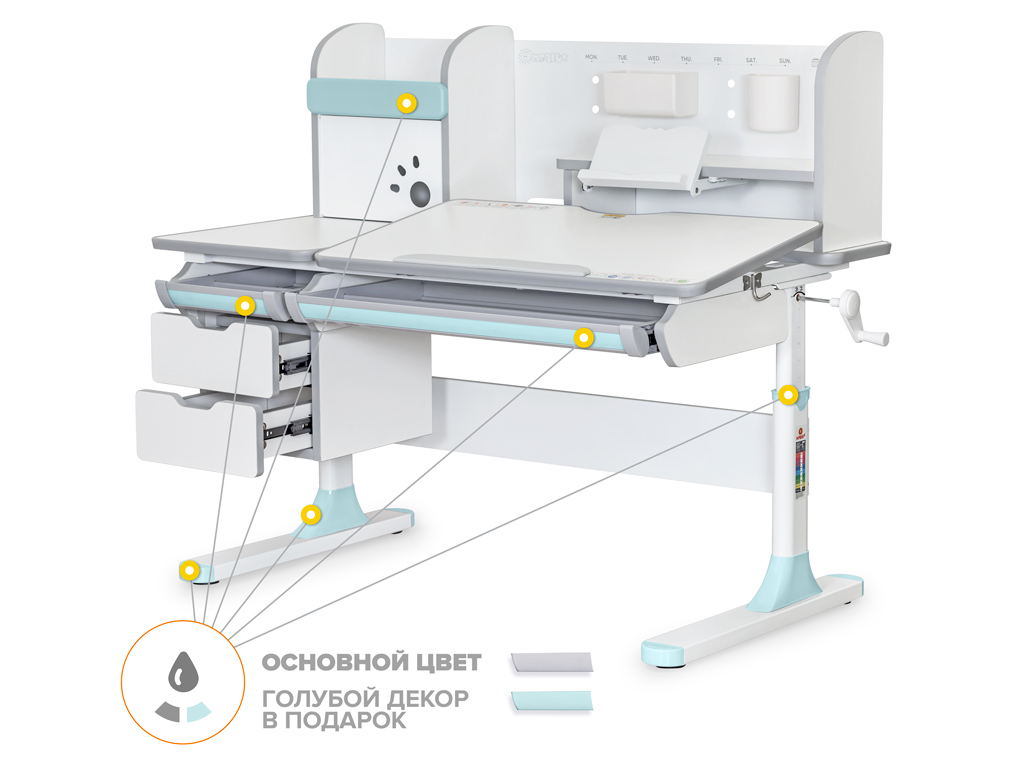 Одной из важных особенностей данной модели является наличие цветных накладок в подарок! Приобретайте полную комплектацию стола в сером цвете и получите розовые либо голубые накладки совершенно бесплатно! Накладки меняются на ножках, выдвижном органайзере и полке надстройке.