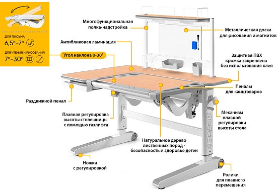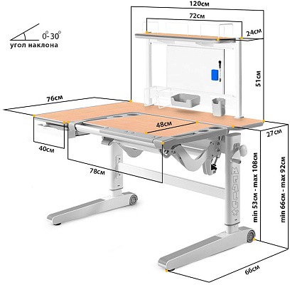 Угол наклона столешницы регулируется в диапазоне 0-30 градусов, плавность регулировки обеспечивается высококачественным механизмом газ-лифт.