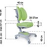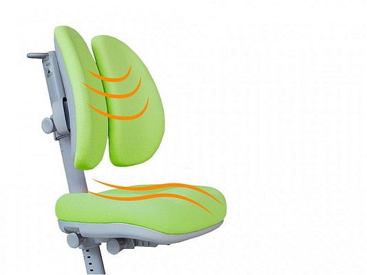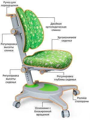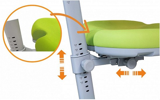 Сиденье кресла регулируется по высоте и глубине. Конструкция кресла разработана с учетом всех анатомических особенностей ребенка, также есть антисколиозная выемка, которая увеличивает глубину кресла для большего примыкания к спине ребенка и обеспечения поясничного упора.