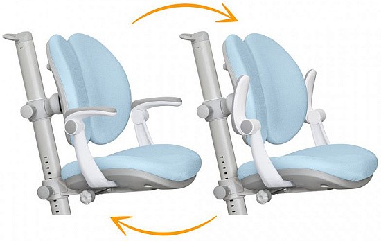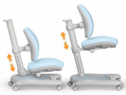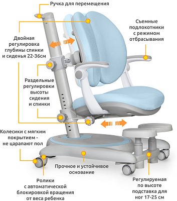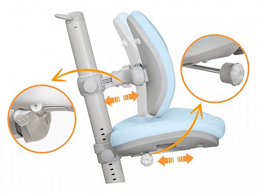 Главная особенность кресла - увеличенный диапазон регулировки глубины сидения за счет подвижной спинки. Глубина спинки плавно регулируется специальным механизмом. Глубина сиденья – ручкой -фиксатором. Кресло подойдет для детей от 3х лет до взрослого возраста.