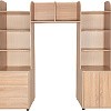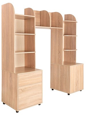 Комплект состоит из двух стеллажей с закругленными полками и двух вместительных тумб. Одна из тумб с ящиками, вторая - с распашными дверцами. Ящики и дверцы открываются простым нажатием на них. Навесная полка крепится между стеллажей. Комплект отлично впишется в интерьер любой комнаты, не только детской. Школьные принадлежности, канцелярия и аксессуары разместятся внутри ящиков.