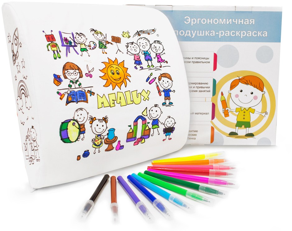 Ортопедическая подушка-раскраска EVO-Mealux поддерживает позвоночник в естественном положении, а также способствует формированию правильной осанки. Подушка фиксируется на спинке стульчика, беспрерывно поддерживает поясничный отдел спины ребенка, снижает нагрузку и минимизируя усталость во время длительного выполнения заданий. Одна из главных особенностей подушки - это съемный чехол-раскраска и набор текстильных фломастеров на водной основе.