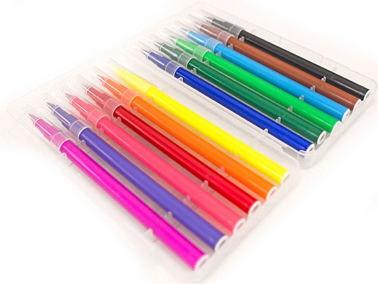 В комплекте пластиковый пенал с набором 12 фломастеров на водной основе. Фломастеры с пером-пулей и яркими чернилами. Благодаря водной основе не имеют запаха и легко смываются с рук.