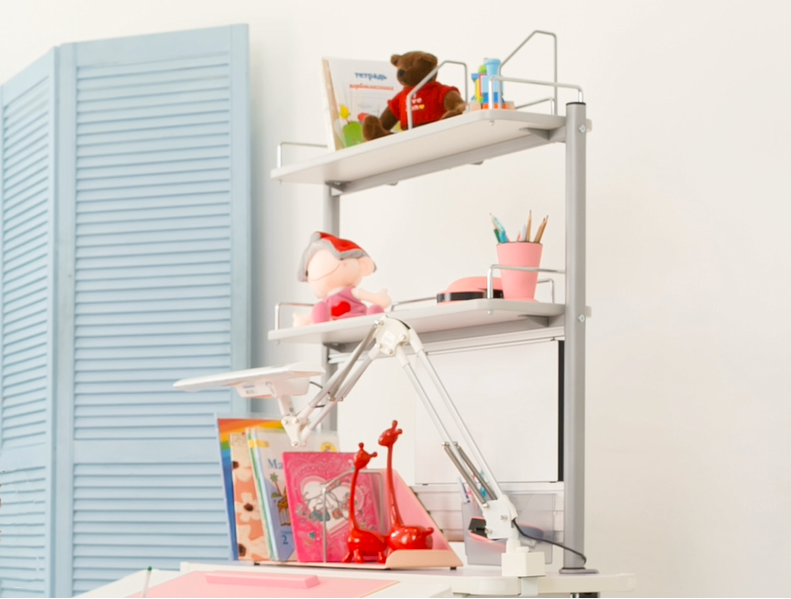 По краям полок сделаны металлические ограничители, чтобы располагать книги и другие принадлежности более устойчиво.