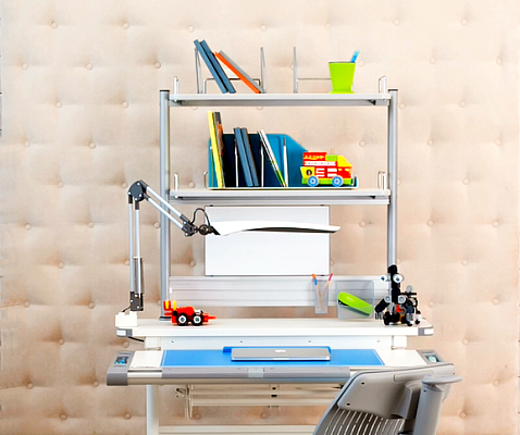 Полка дополнена передвижной магнитной доской, на которой удобно располагать, например, расписание уроков, а также можно писать маркетрами.
