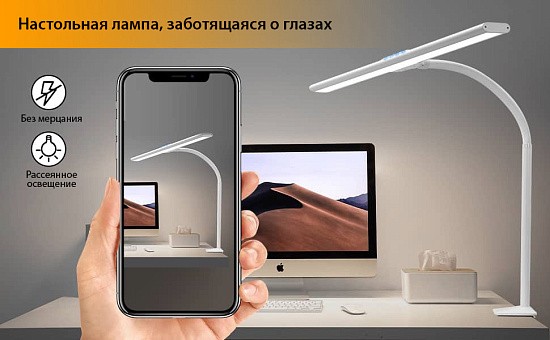 LED лампа DL-1020 - создаст комфортные условия на рабочем столе, так как работа светодиодов устроена таким образом, что не образуются блики на поверхности монитора, других гаджетов, а также на столешнице.